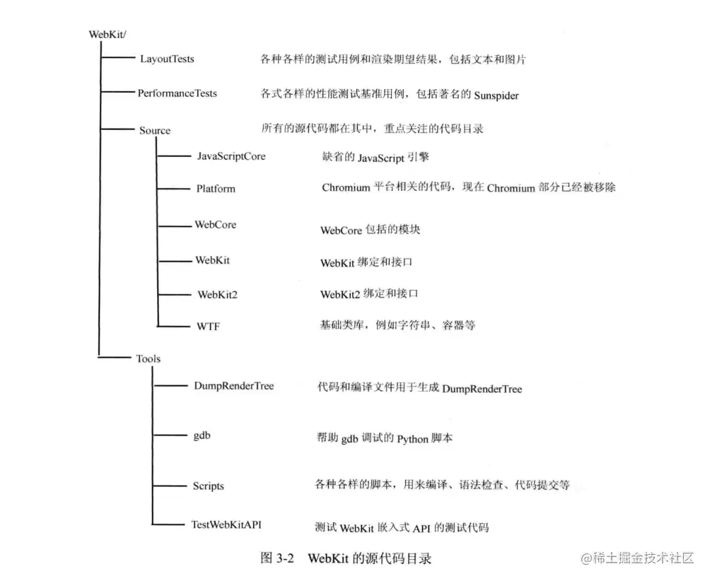 在一级目录中,重要的目录有四个:LayoutTests、PerformanceTests、Source、Tools,其他目录可忽略。其中,Source目录最重要,是之后主要讲解的部分。Source下重要的子目录包括:JavaScriptCore、Platform、WebCore、WebKit、WebKit2、WTF。详细解释见图3-2。
