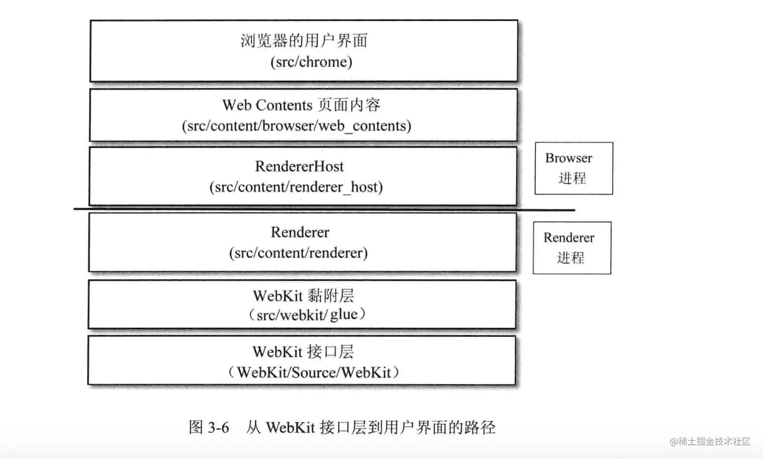 Browser进程和Renderer进程都是在webkit接口之外由Chromium引入的,这里介绍一下他们是如何利用webkit接口工作的,代码层次见3-6。