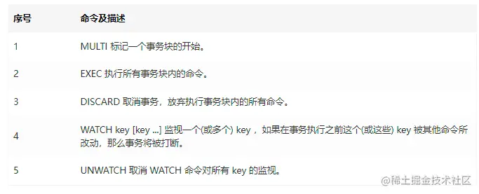 Redis 的事务包含如下命令: