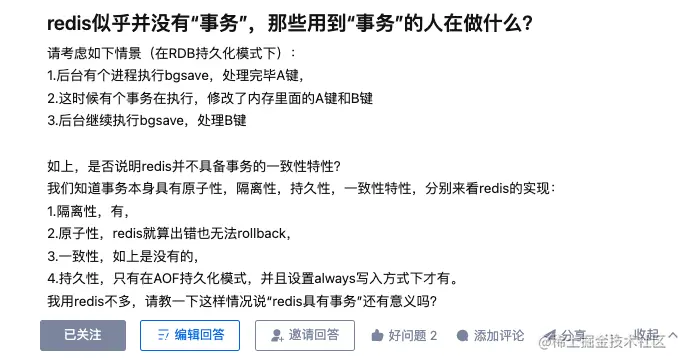 我们通常称 Redis 为内存数据库 , 不同于传统的关系数据库,为了提供了更高的性能,更快的写入速度,在设计和实现层面做了一些平衡,并不能完全支持事务的 ACID。