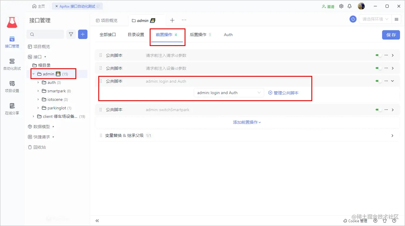 后台有很多接口访问都需要登录,如果一个个地去设置 前置脚本 就太麻烦了,所以这里我们直接在 admin 后端接口的分组目录上设置 前置操作 公共脚本admin: login and Auth,这样整个 admin 下的全部接口都能自动登录了: