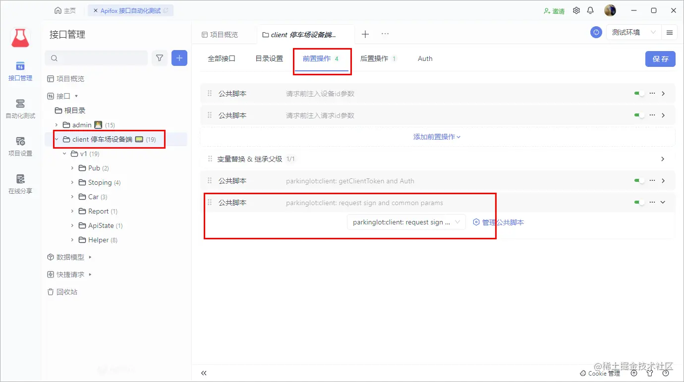 然后 把 自动加签的公共脚本设置到 client 停车场设备端 📟 分组 的前置脚本中,这样其下所有接口请求时都有 sign 参数了。