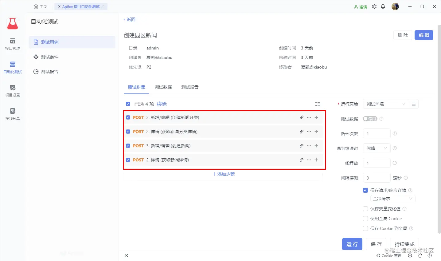 如果每次测试都需要我们手动点击 运行按钮 就太不方便了,没错,Apifox 当然也考虑到了这点,Apifox CLI 就可以帮助我们实现自动化的测试。