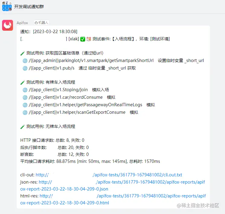 我们在 Apifox.php 脚本执行测试命令,并解析测试生成的 json 文件,然后将结果拼装发送到钉钉群,如果有失败会 at 相应的开发人员: