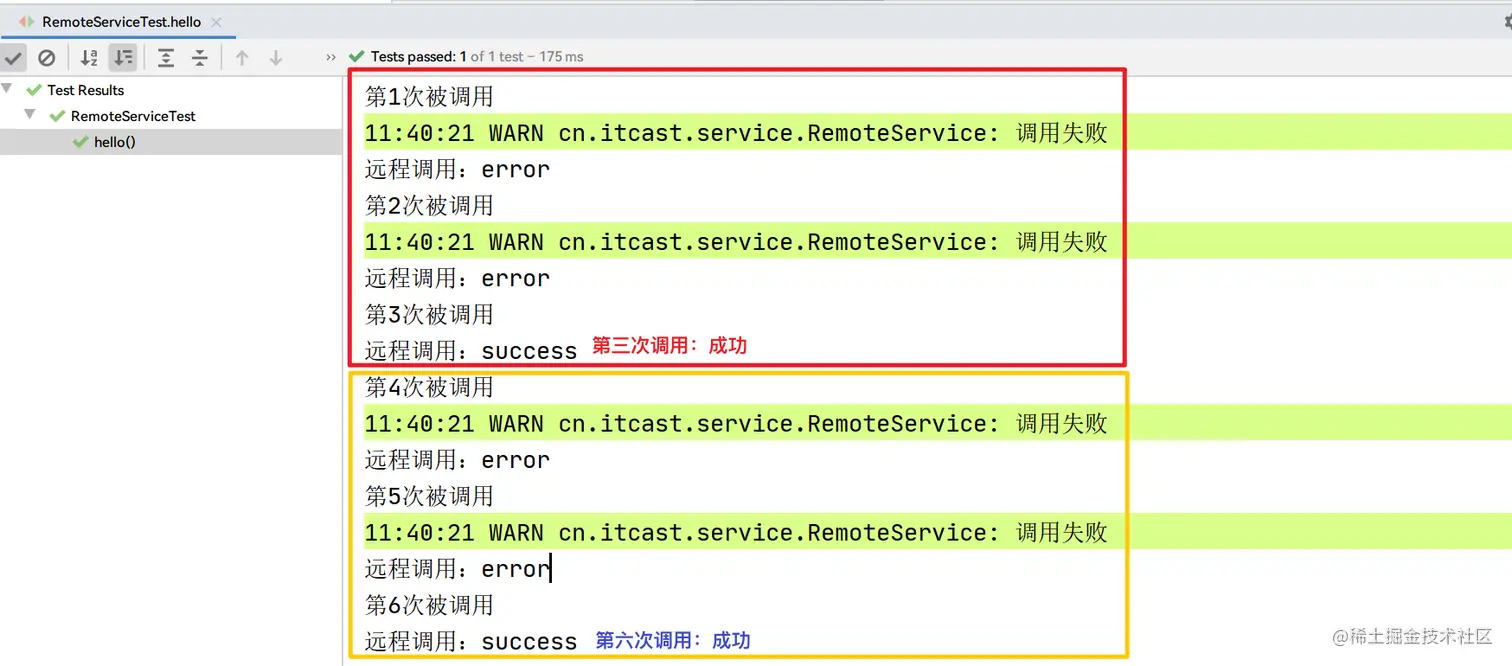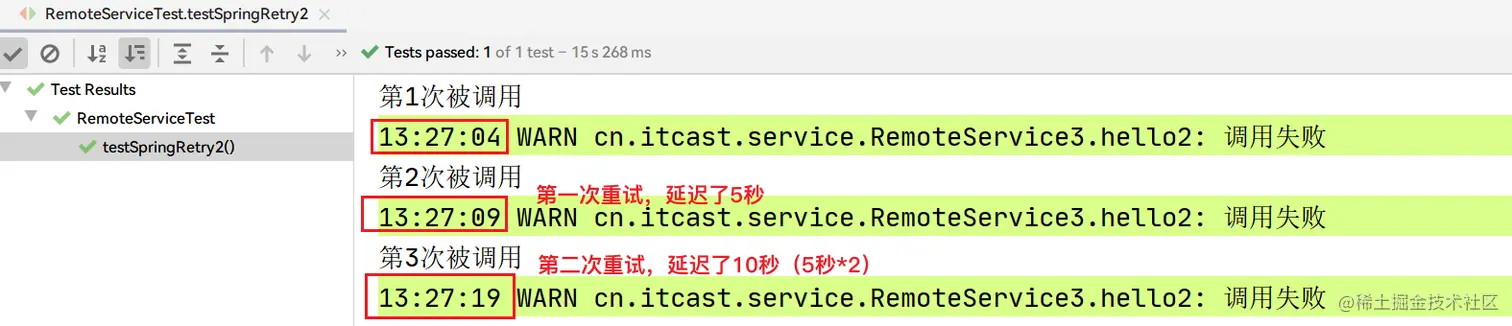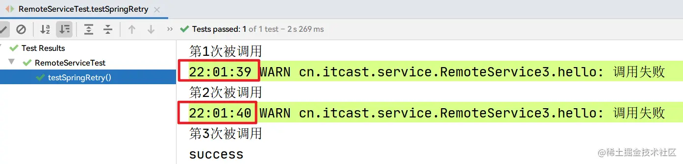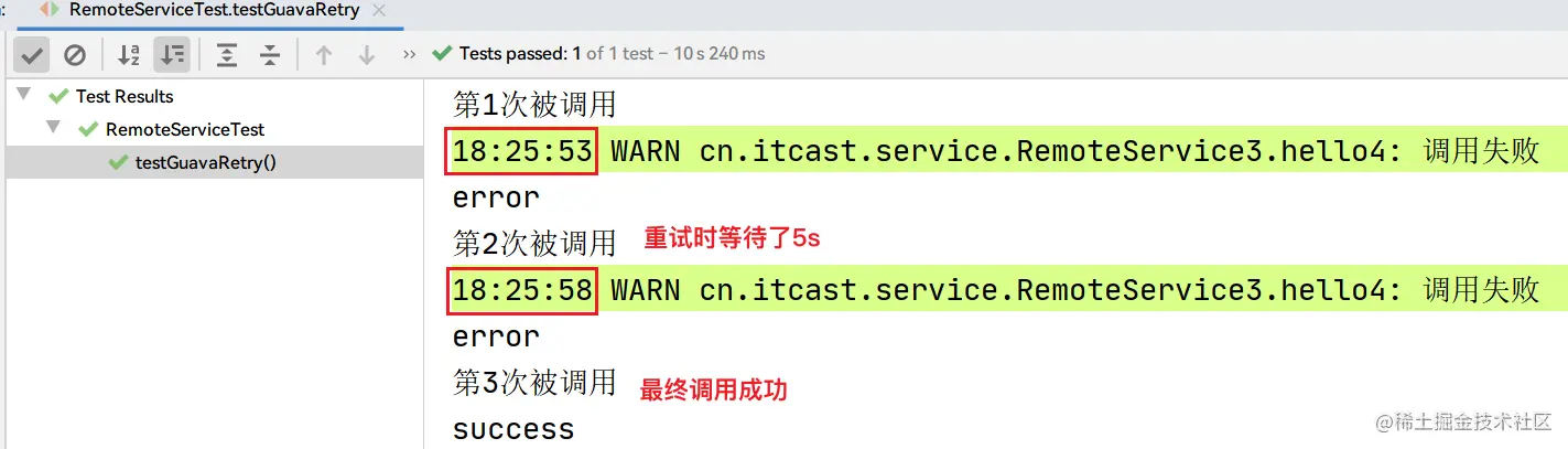 同时在上边的单元测试中用for循环进行失败重试:在调用的时候如果失败则会进行了重复调用,直到成功