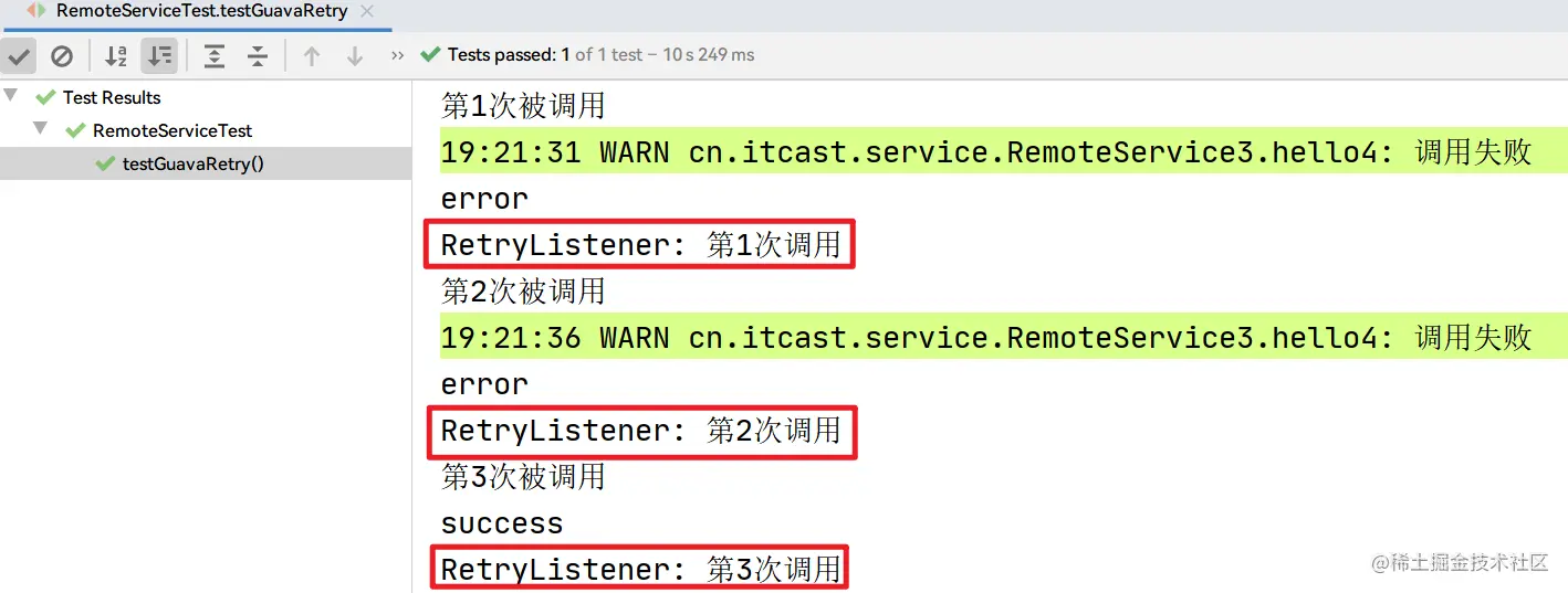 - .withRetryListener(new RetryListener() { @Override public void onRetry(Attempt attempt) { System.out.println("RetryListener: 第" + attempt.getAttemptNumber() + "次调用"); } }) //也可以注册多个RetryListener,会按照注册顺序依次调用