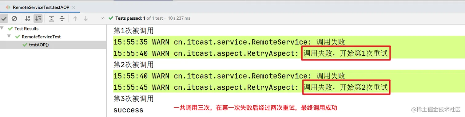 这样即不用编写重复代码,实现上也比较优雅了:一个注解就实现重试。