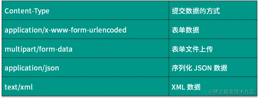 表格中列出了 Content-Type 和 POST 提交数据方式的关系。
