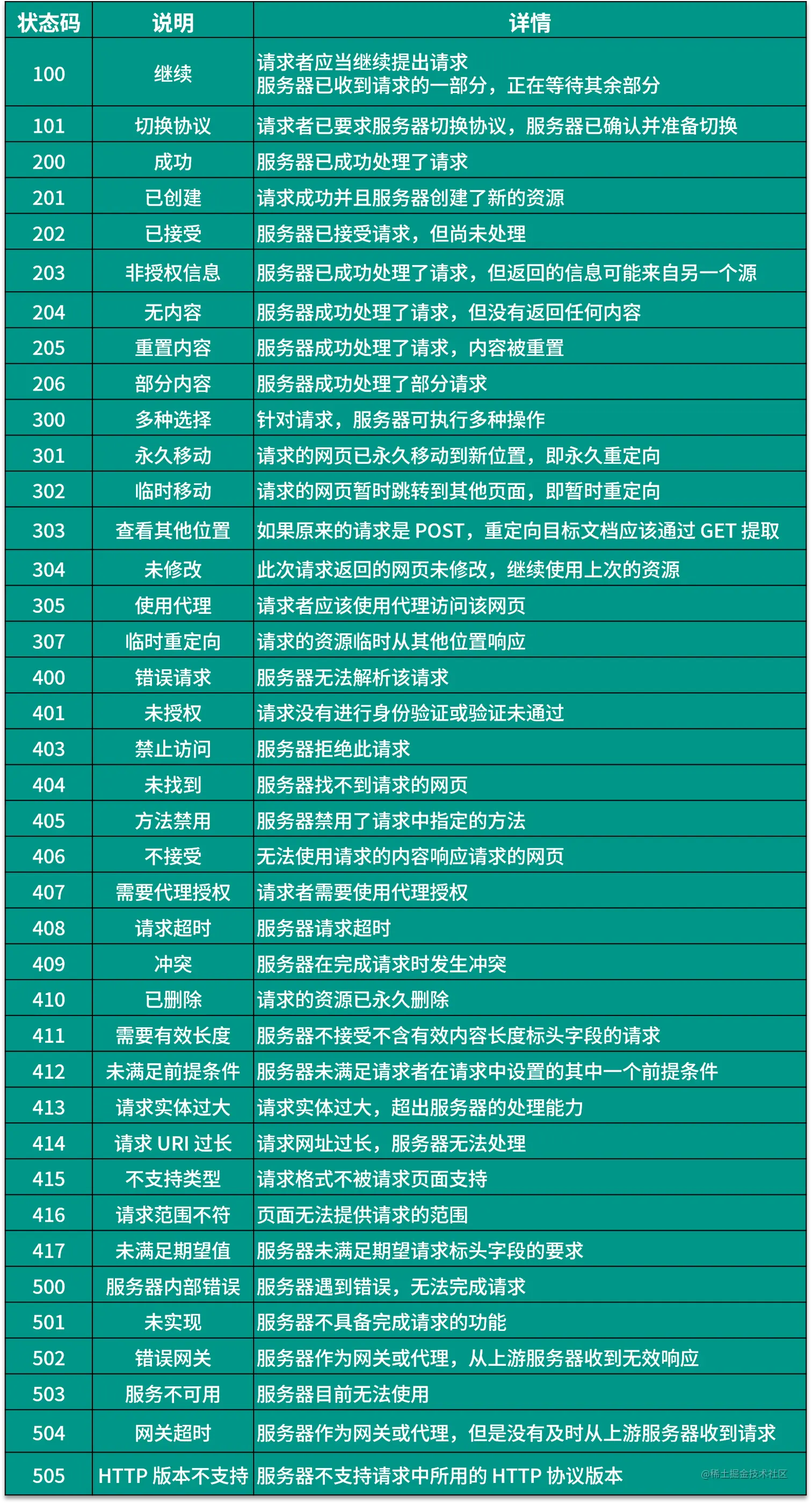 - Content-Type:也叫互联网媒体类型(Internet Media Type)或者 MIME 类型,在 HTTP 协议消息头中,它用来表示具体请求中的媒体类型信息。例如,text/html 代表 HTML 格式,image/gif 代表 GIF 图片,application/json 代表 JSON 类型,更多对应关系可以查看此对照表:tool.oschina.net/commons。