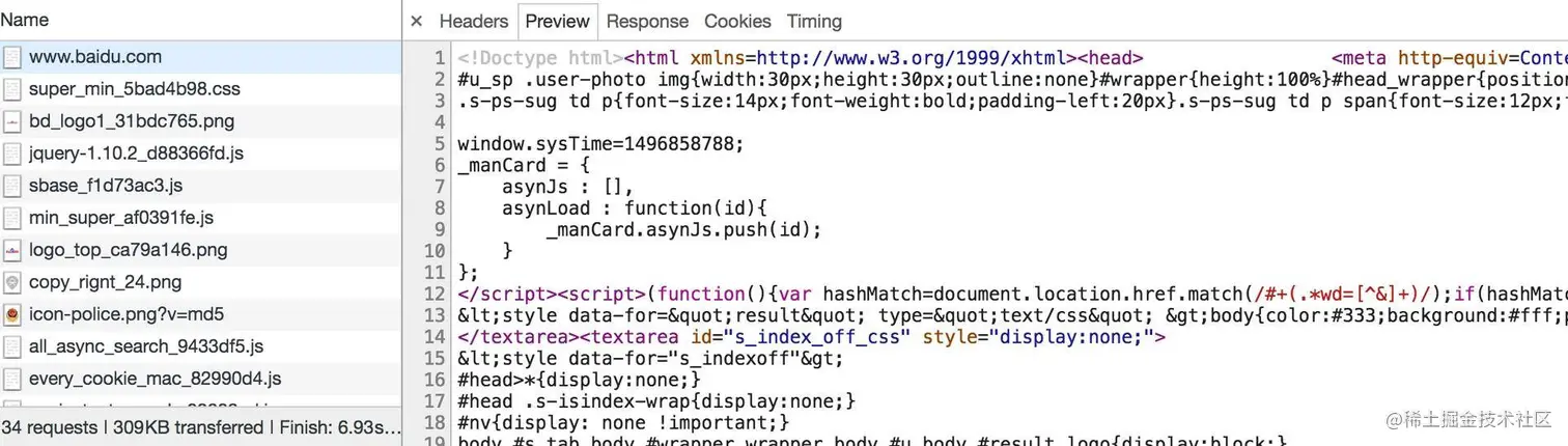 为了更直观地说明这个过程,这里用 Chrome 浏览器的开发者模式下的 Network 监听组件来做下演示,它可以显示访问当前请求网页时发生的所有网络请求和响应。