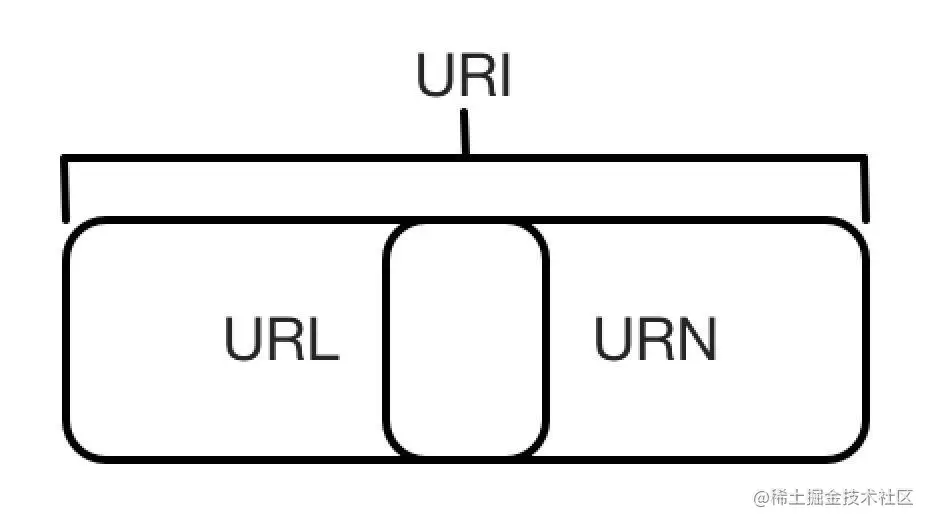 URN 只命名资源而不指定如何定位资源,比如 urn:isbn:0451450523 指定了一本书的 ISBN,可以唯一标识这本书,但是没有指定到哪里定位这本书,这就是 URN。URL、URN 和 URI 的关系可以用图表示。