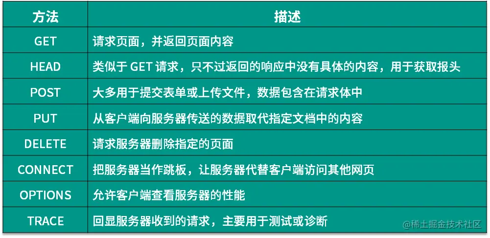我们平常遇到的绝大部分请求都是 GET 或 POST 请求,另外还有一些请求方法,如 HEAD、PUT、DELETE、OPTIONS、CONNECT、TRACE 等,我们简单将其总结为下表。