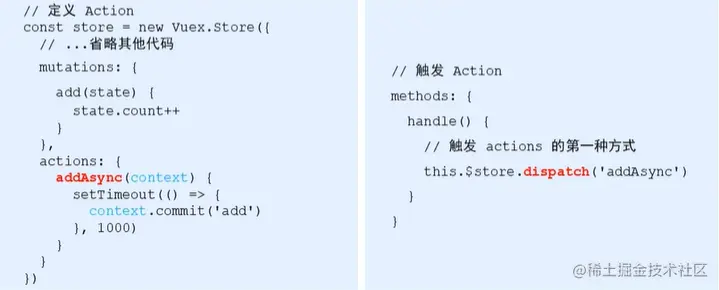 注意:action只负责执行异步操作,如果像修改数据,还是得通过context.commit触发某个mutation才行.