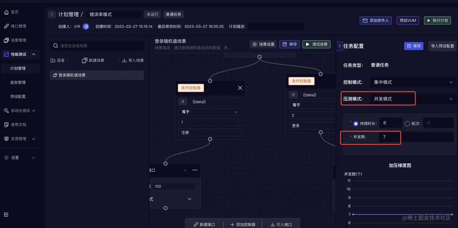 在进行性能测试前,需要定义应用程序或网站的测试场景。这包括模拟真实用户行为、生成大量的虚拟用户等。这一步需要根据实际的业务需求和场景来设计,并且需要结合应用程序或网站的特点进行调整。为了提高测试效率RunnerGo推出的可视化场景配置,通过连接接口方块和条件控制器可以快速配置测试场景。