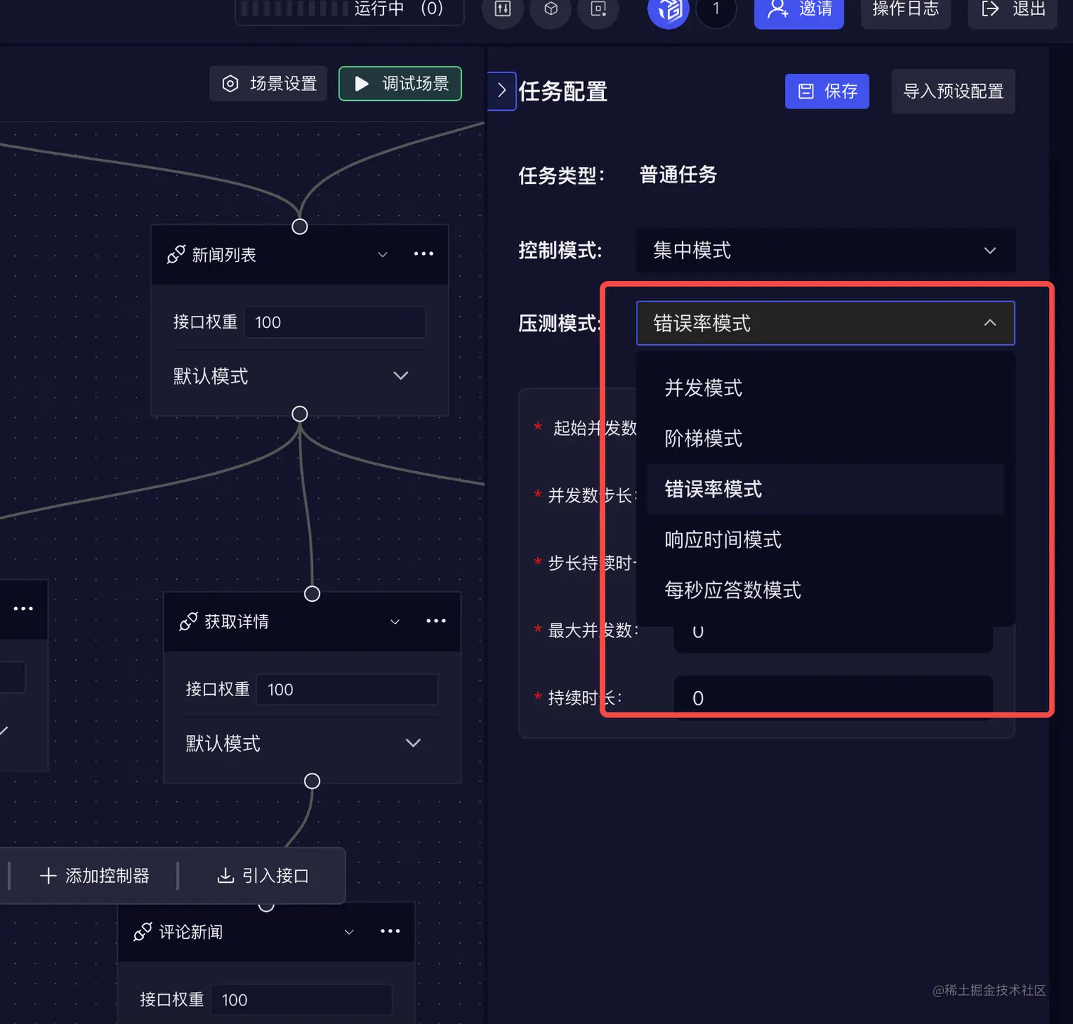 这里RunnerGo支持多种压测模式选择无需下载插件即可配置。