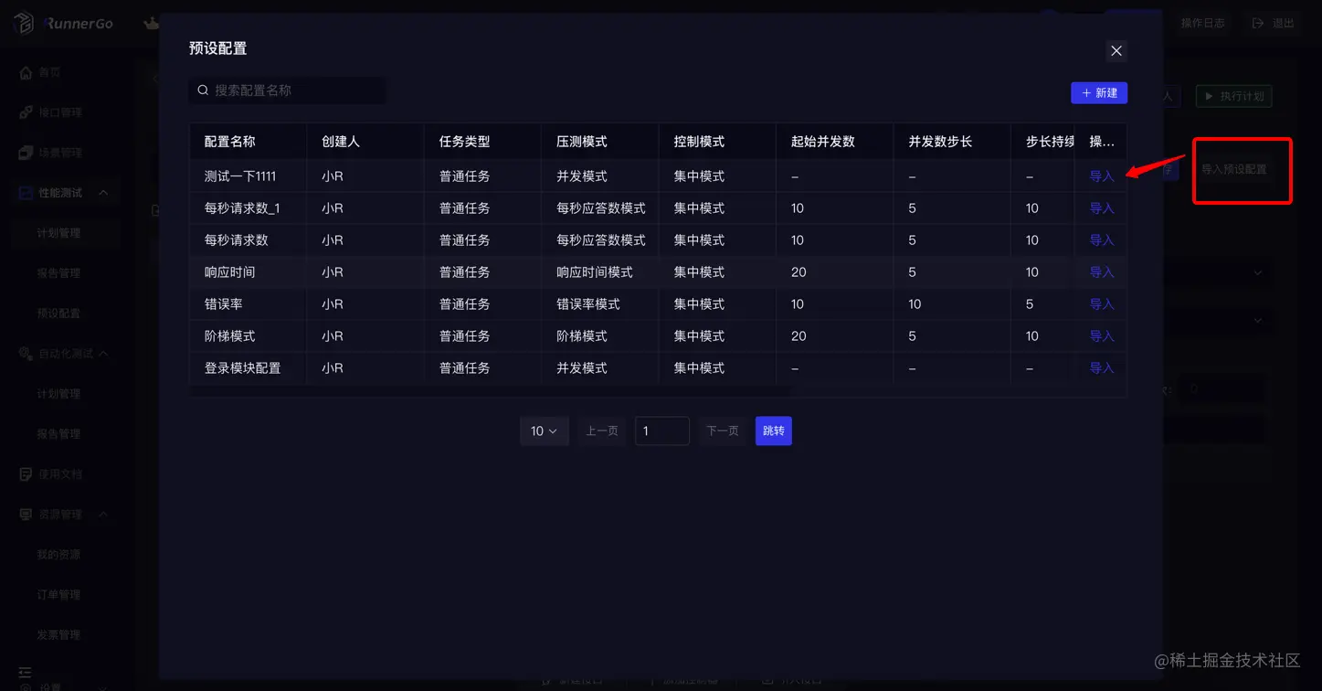 点击左侧导航栏:性能测试-预设配置,点击左上角“新建”按钮,配置预设参数。