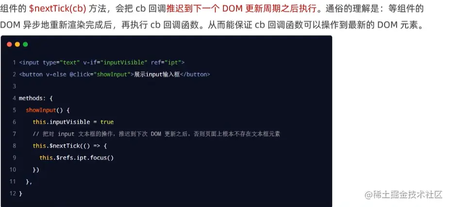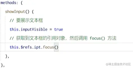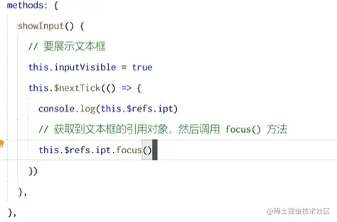 是因为,ref是异步执行的,当showInput方法中第一步执行完之后会立刻取获取ipt实例,但此时数据还没来得及渲染上去,所以无法获得ipt实例。