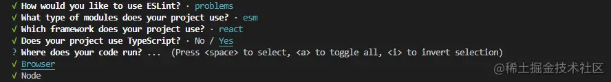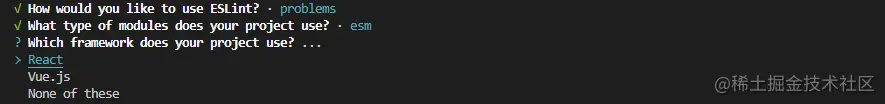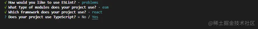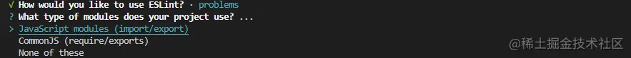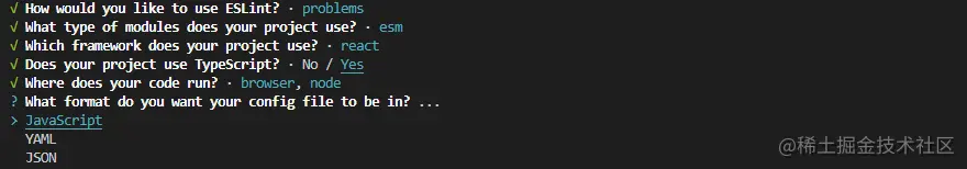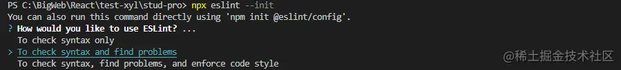 在项目根目录下执行npx eslint --init或者npm init @eslint/config,然后根据提示选择配置