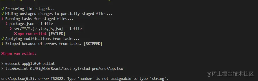 然后将有语法问题的代码提交到暂存区,如App.tsx,然后执行npx lint-staged