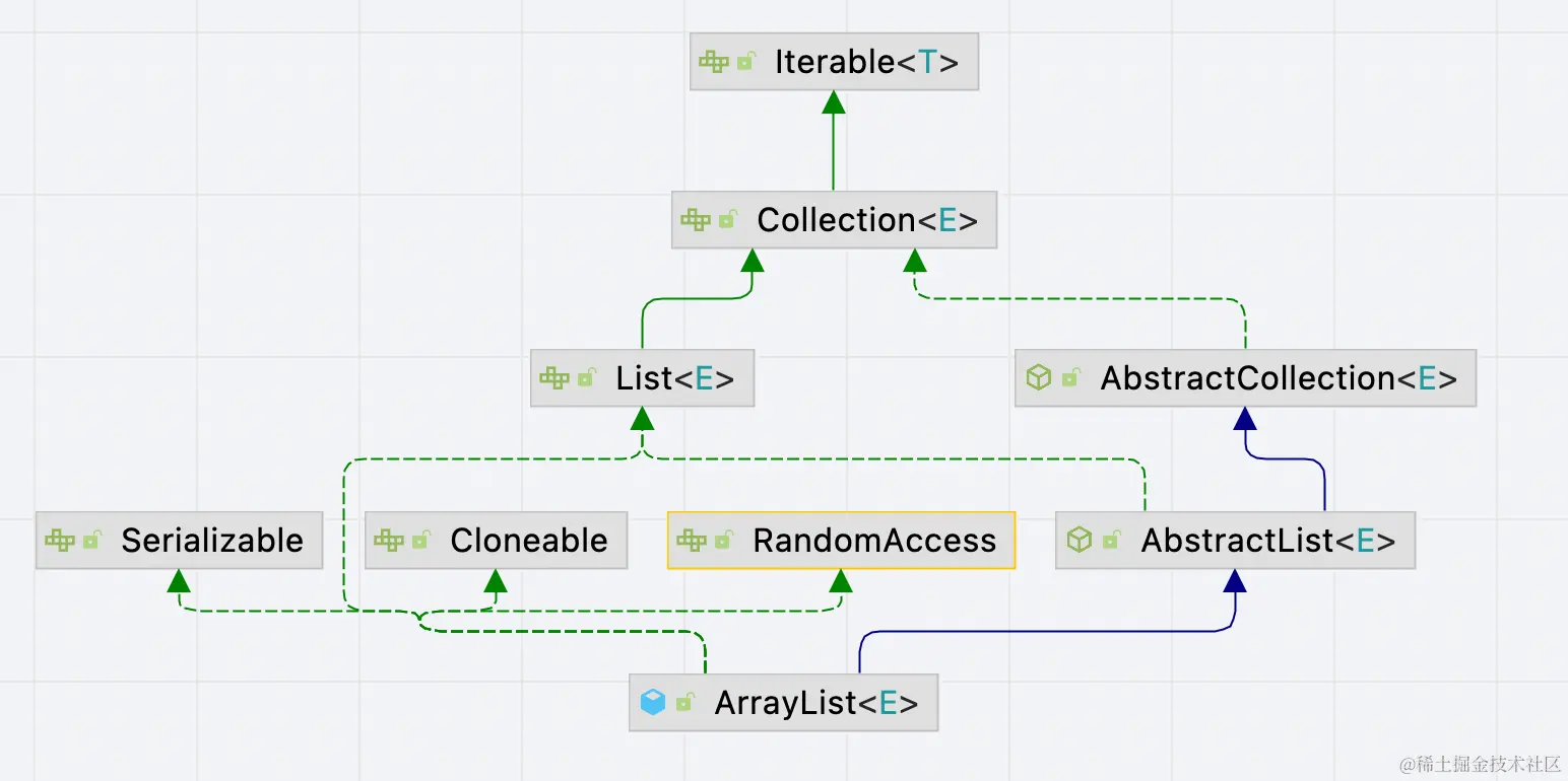 通过上面的类图我们用一句话描述一下ArrayList:ArrayList是一个可迭代,可拷贝,可以被序列化的一个动态数组。
