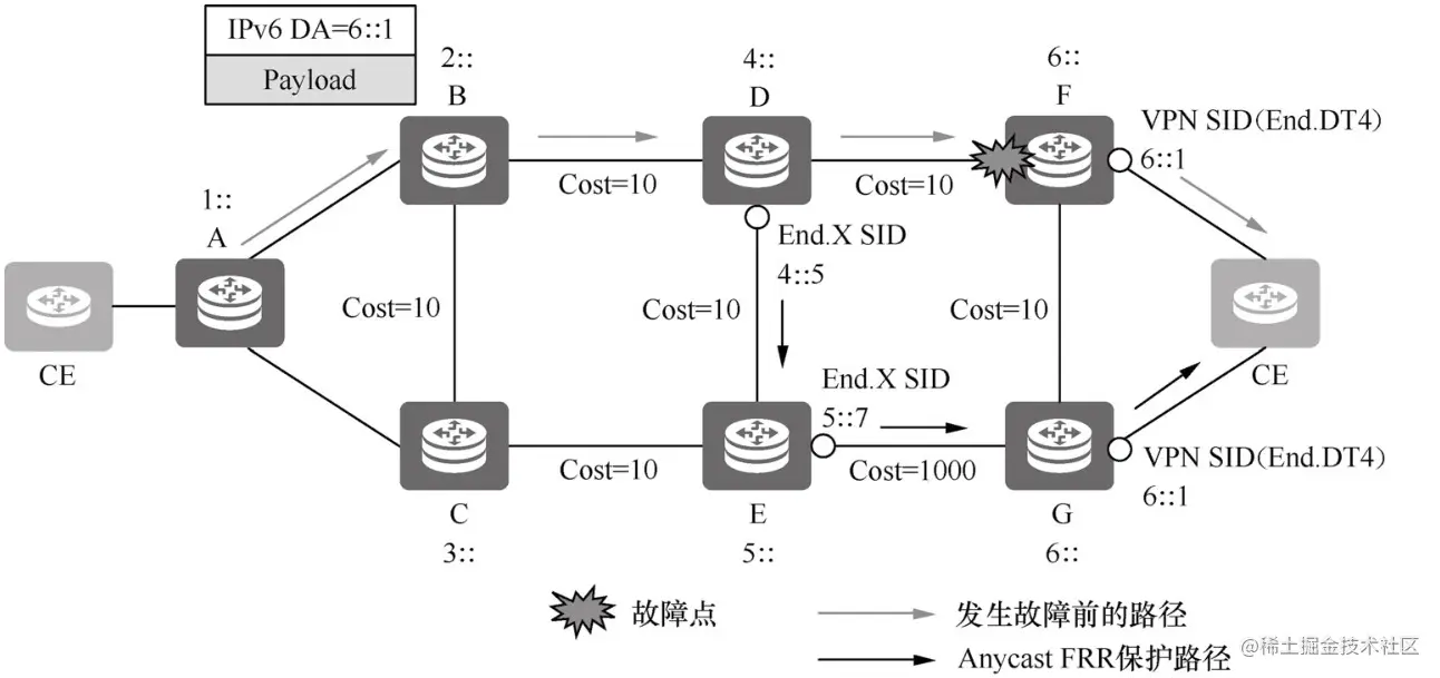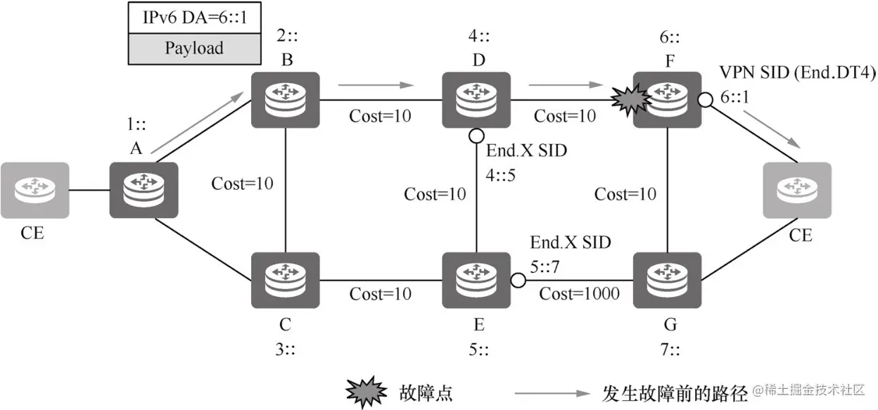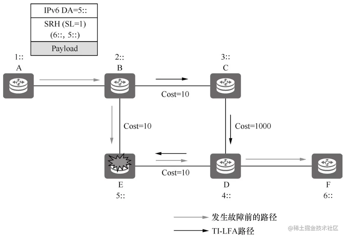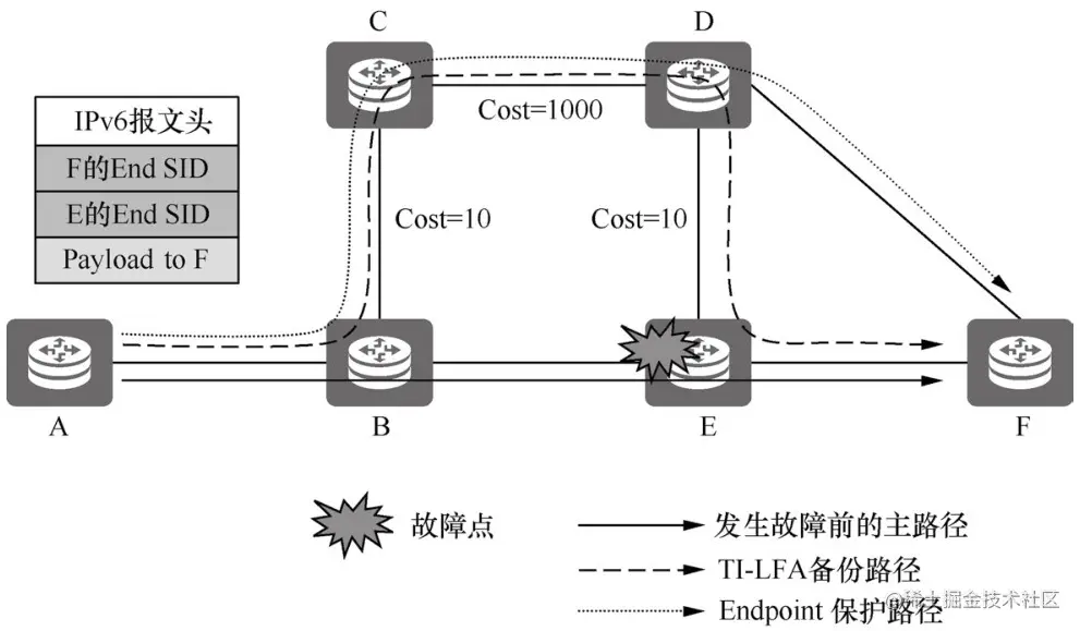 如图6-10所示,节点A发送报文携带Segment List <E,F>。由于TI-LFA是根据报文目的地址计算一条备份路径,所以TI-LFA计算的备份路径也经过节点E。如果节点E发生故障,普通TI-LFA无法实现保护作用。而SRv6 Endpoint保护是根据下层SID计算的备份转发路径,所以它能绕过故障的Endpoint节点。