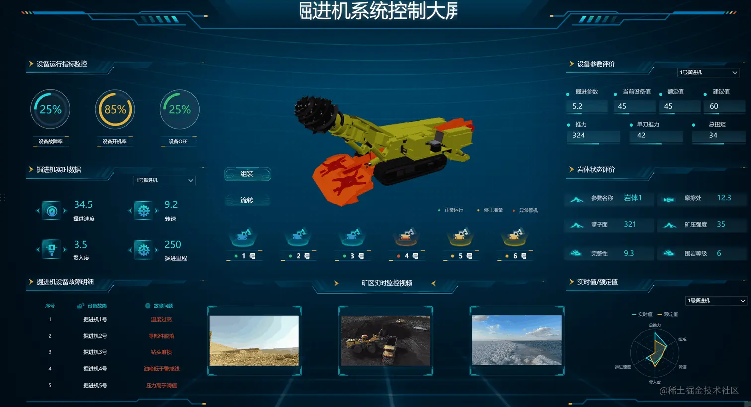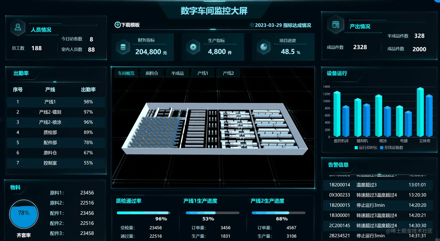 数字车间:通过投射物理世界的人,物到大屏, FineVis通过数字化的设备监控, 智能化的根据指标来评价设备的状态,监控和提醒设备的生命周期,进一步提高工作效率,降低设备成本。产出情况的实时呈现和当天的生产指标的对比,管理者可以更精确的利用人工,推进项目进度。
