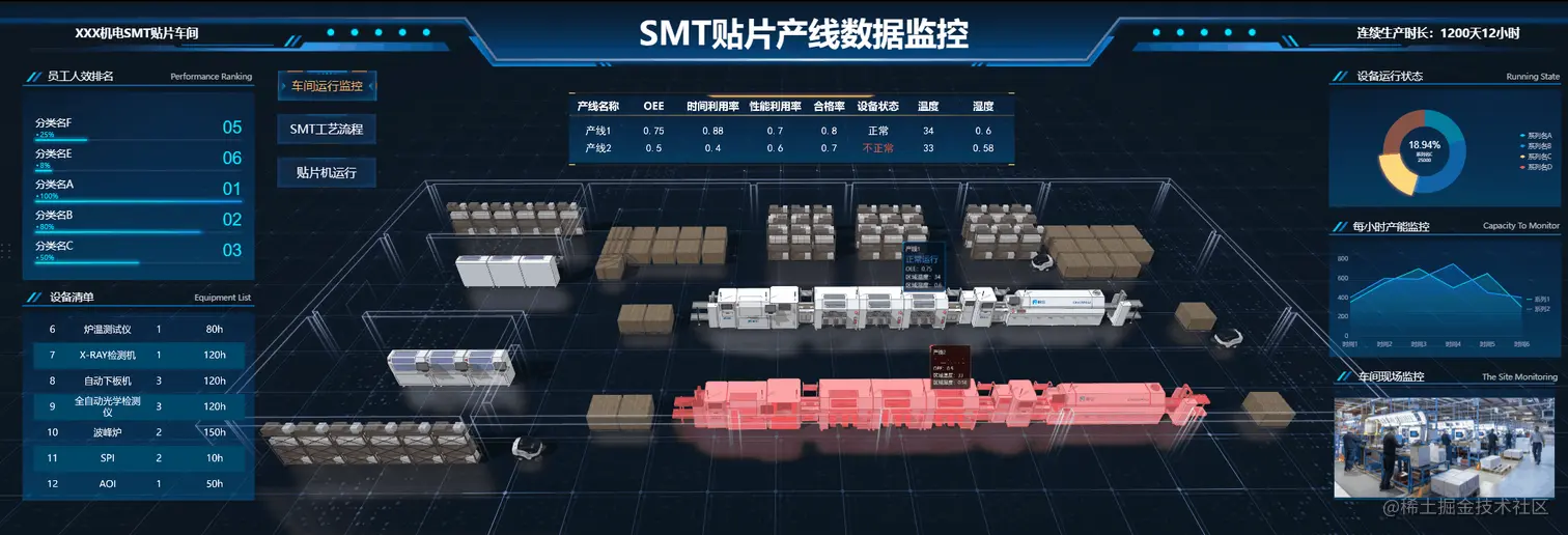 SMT贴片产线监控:通过对环境,生产设备,产能的监控,在节省人力的基础上,管理者也可以实时去调整设备的状态来获得更高效的生产方案。发生故障时,该系统可以快速定位出哪个设备出现问题,为管理者提供有效的辅助决策,提高生产效率。