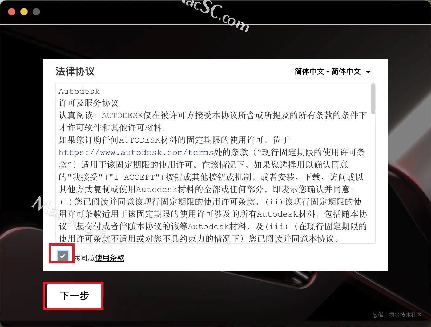 勾选我同意AutoCAD 2024使用条款,然后点击【下一步】。