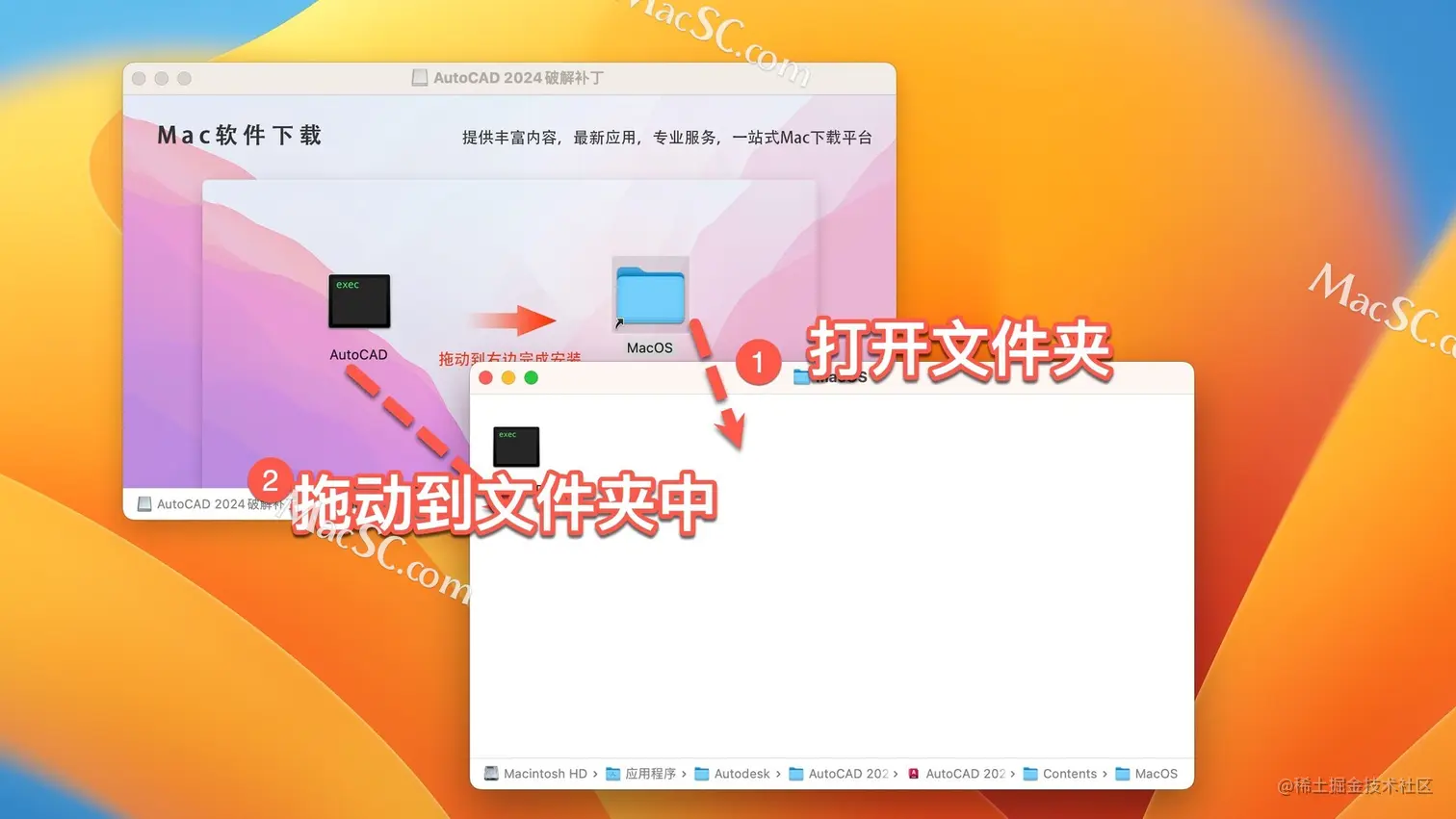 打开右侧的MacOS文件夹,将左侧的CAD文件 拖放到打开的文件夹中 替换即可。