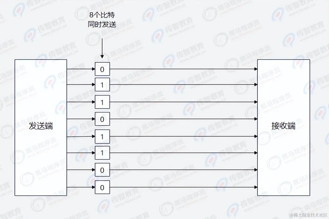 并行通信指将数据分组后,以组为单位在多个并行信道上同时传输数据,组内的每位数据占用一条信道。计算机中的8位二进制代码表示一个字符,假设每次传输8个比特,则串行通信如下图所示。