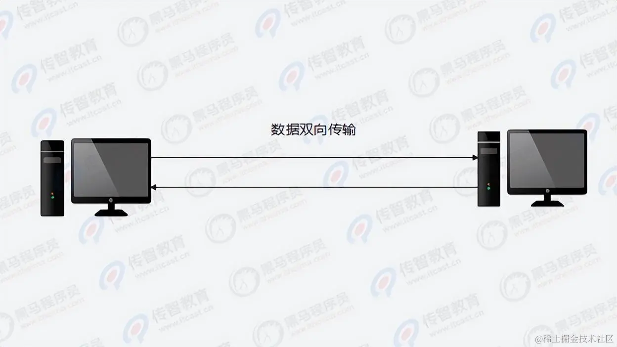 全双工通信指通信双方在任何时刻均可发送和接收数据。全双工通信中使用两条信道,其中一条信道用于发送数据,一条信道用于接收数据,如下图所示。