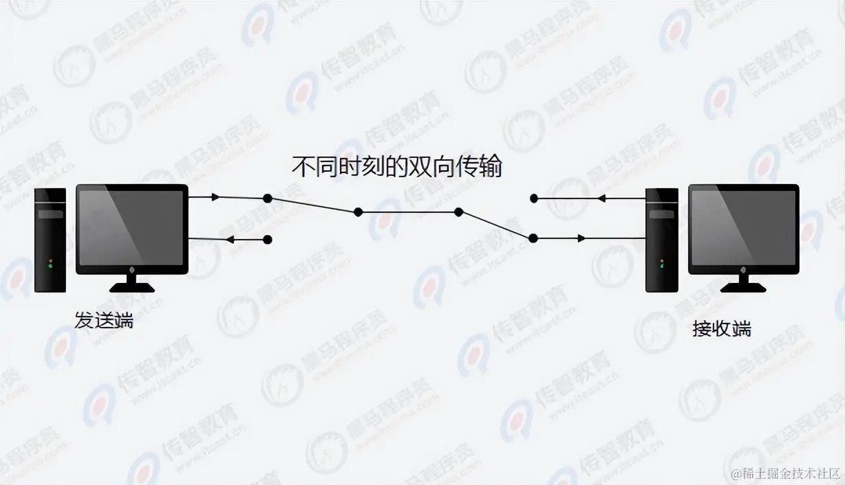 管日半双工通信指通信双方均可进行数据发送与接收,但不能同时具备两种功能。在同一时刻,信号只能从一端发向另一端,若要改变信号传输方向,需进行线路切换,如下图所示。