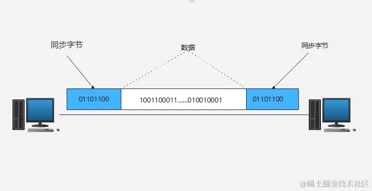 同步通信方式中不必为每个字符码添加起始位和终止位,而是在每次发送数据前,先发送一个同步字节,使双方建立同步关系,之后在同步关系下逐位发送/接收数据,到数据发送完毕再次发送同步字节终止通信。具体如下图所示。