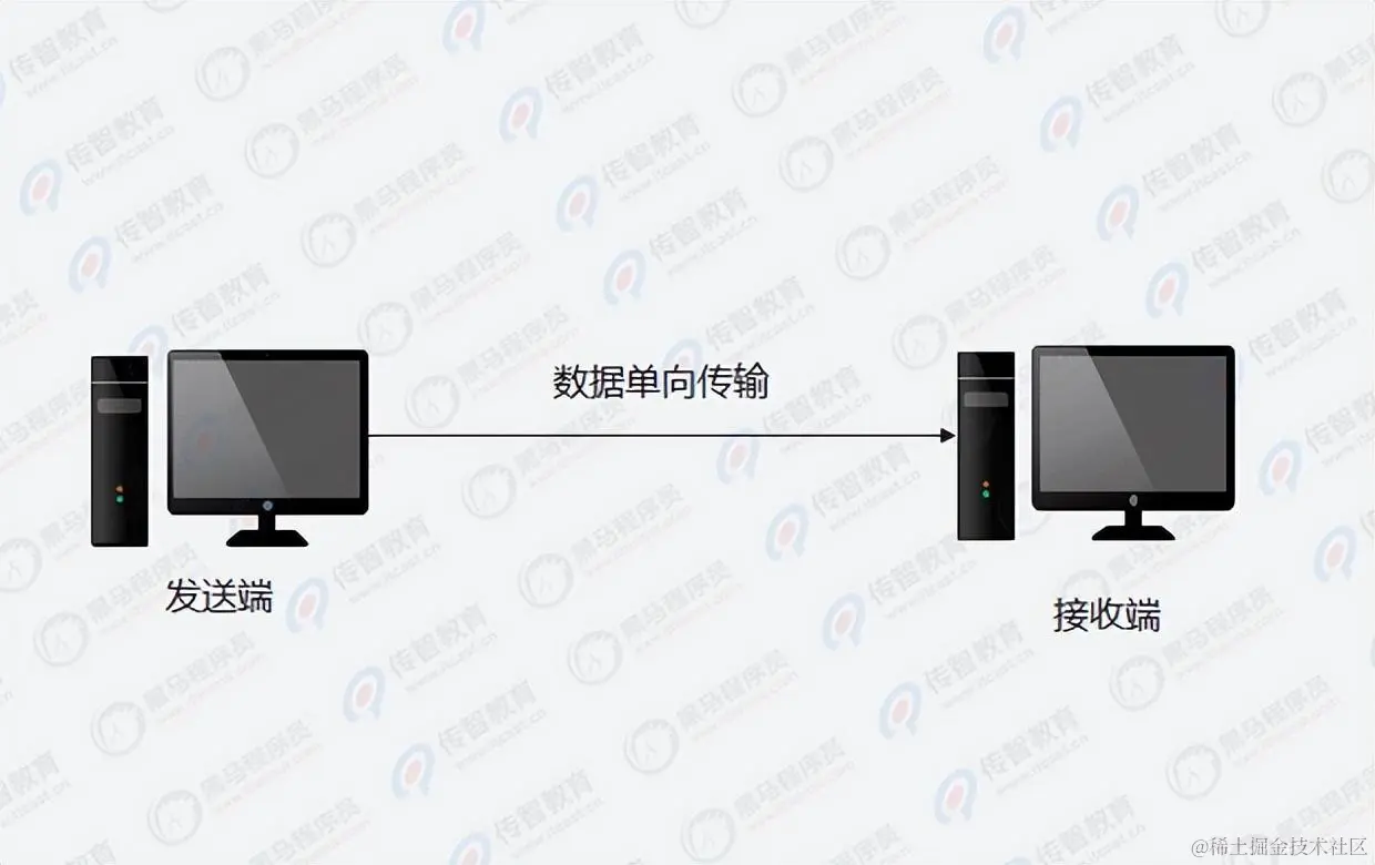 单工通信指在任一时刻,信号只能由通信双方中的端发往另一端,在信道上单向传输。此种方式中信道两端节点的功能固定,发送方只能发送数据,不能接收数据;接收方只能接收数据不能发送数据,如下图所示。