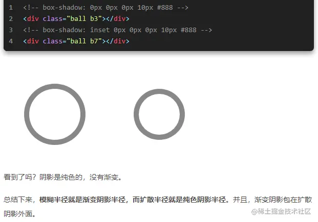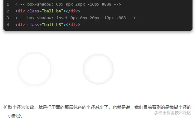 - 小于0的时候,阴影会缩小。这种情况下往往你也看不到,需要设置一层很厚的模糊半径,然后慢慢调低扩散半径你才能看出区别。