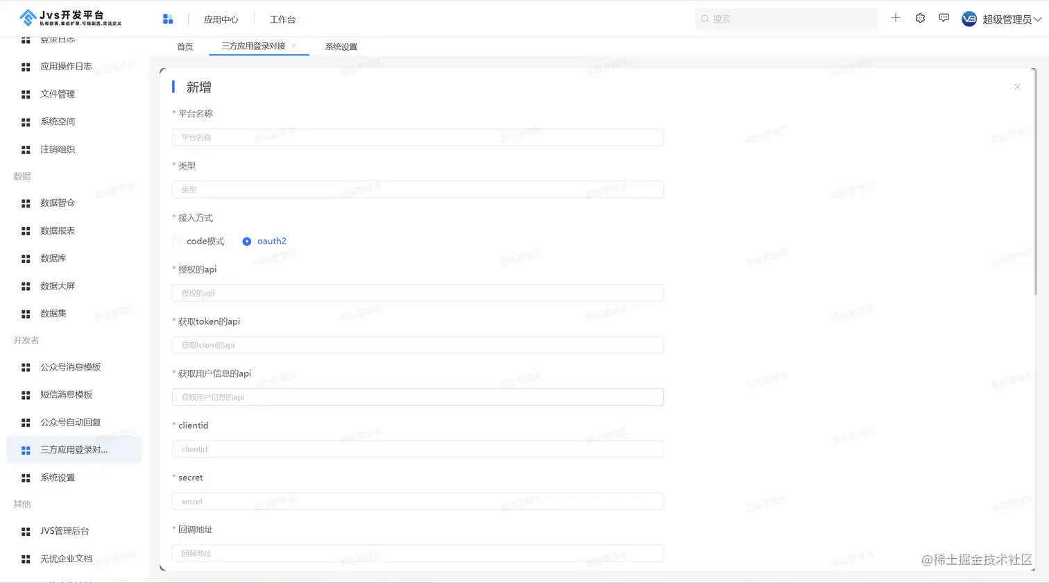 1、 在JVS平台打开系统后台,点击三方应用登录对接,进入页面进行配置。