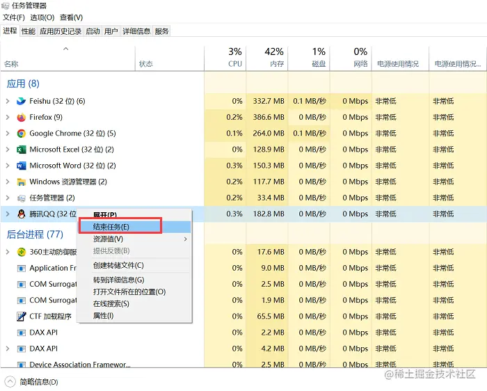 步骤3:选中相应的进程或应用,右键点击 【结束任务】 来关闭不需要的软件和任务。