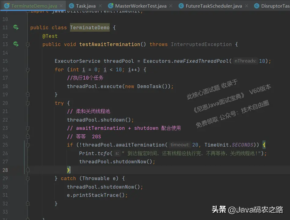 awaitTermination 一般与shutdown()方法结合使用,下面是一个例子: