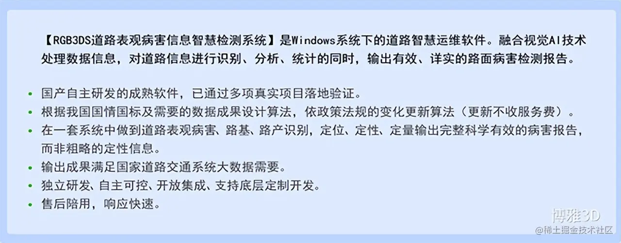博雅弘拓科技20余年精研计算机视觉技术的延伸区应用,现将AI识别技术延伸至智慧交通领域的道路识别层面,自主研发的【RGB3DS道路表观病害信息智慧检测系统】软件涉及的算法识别、深度学习、融合GPS均为自有技术,拥有诸多软著与专利权,软件安全性与可靠性高。