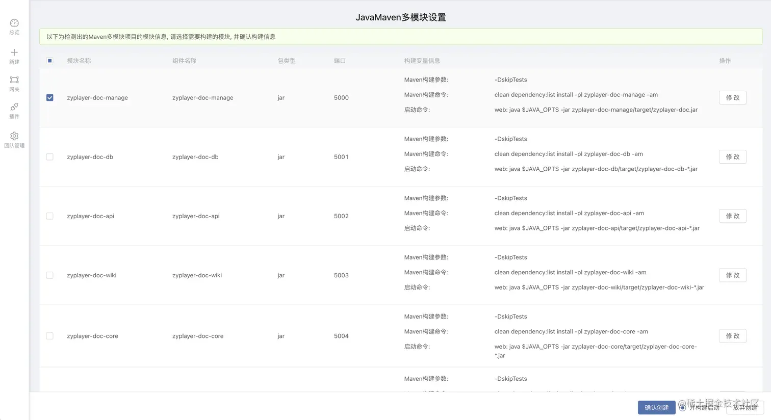 然后 Rainbond 会检测出来为多模块项目,选择 zyplayer-doc-manage 并进行构建,其他模块都是依赖项,是不可运行的。