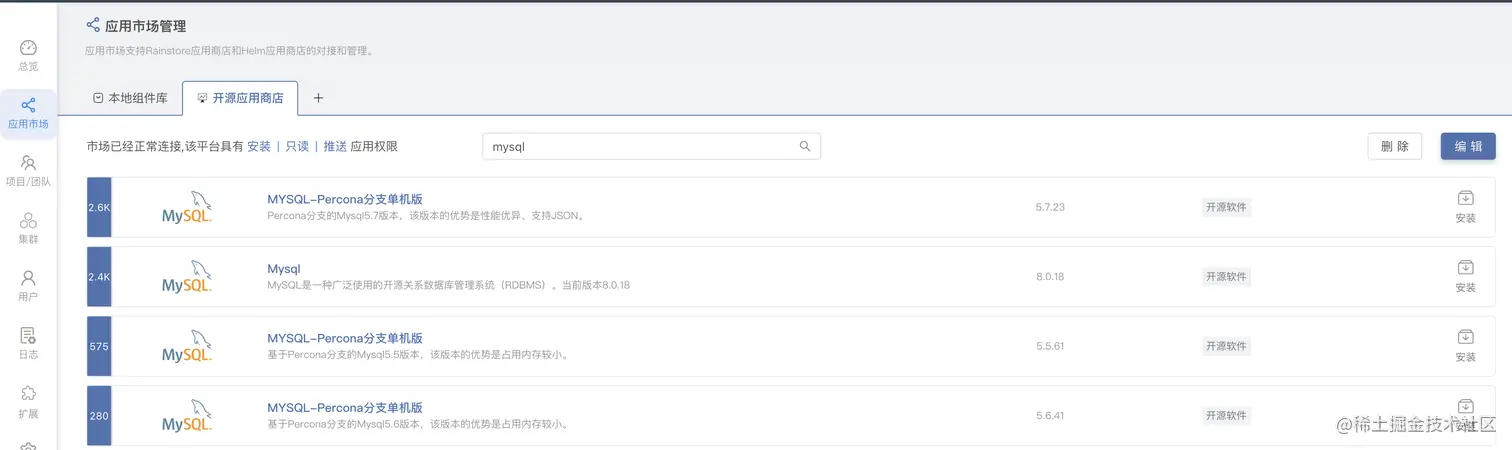 在 Rainbond 的 平台管理 -> 应用市场 -> 开源应用商店 中搜索 mysql 并安装,可选择安装 5.7 或 8.0 版本。