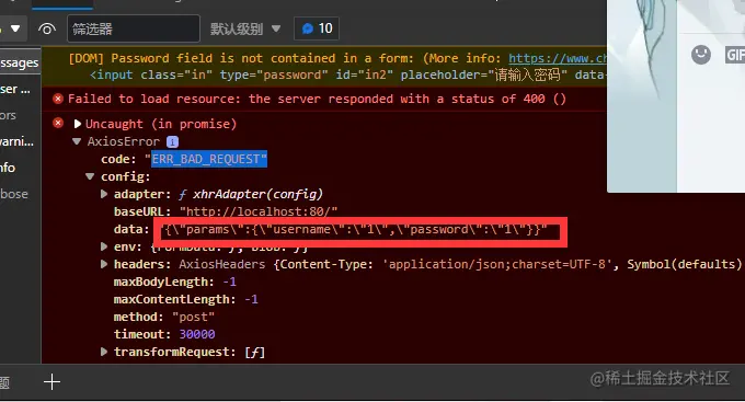 但由于前端用params包裹起来了,后端接收的确是params内部的username和password,所以前后端对应不上,导致前端的post请求找不到对应的接口,找不到对应的接口所以报了404错误。