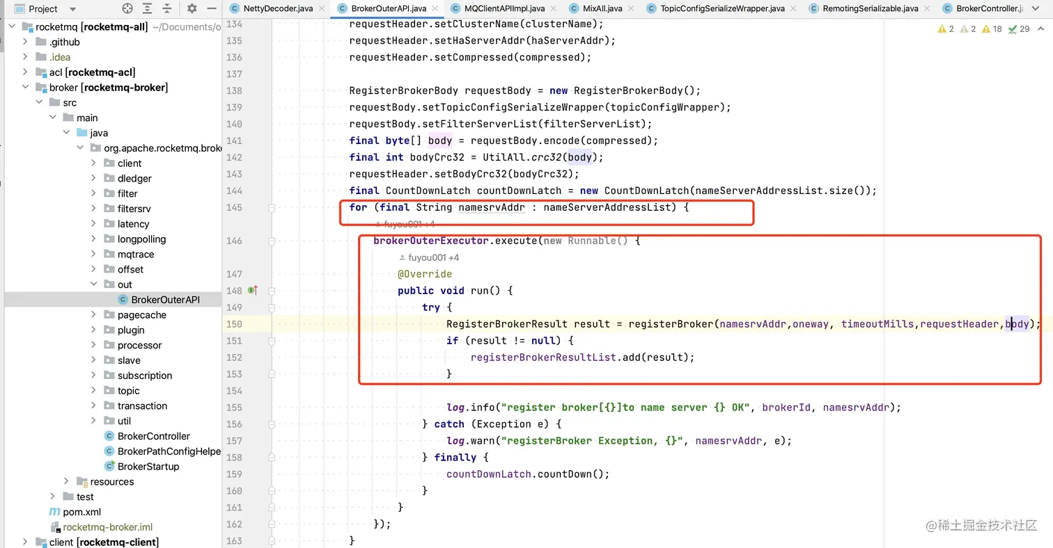 前面在排查的过程中也发现了,broker源码中通过遍历nameserverlist,在线程池中异步注册topic信息到nameserver。
