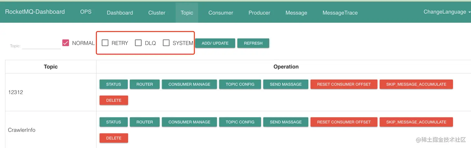 前面说到在控制台上看到当前集群中只有300+topic,这里其实是一个误区,只勾选了NORMAL类型的topic,并没有注意RETRY、DLQ、SYSTEM类型的topic。