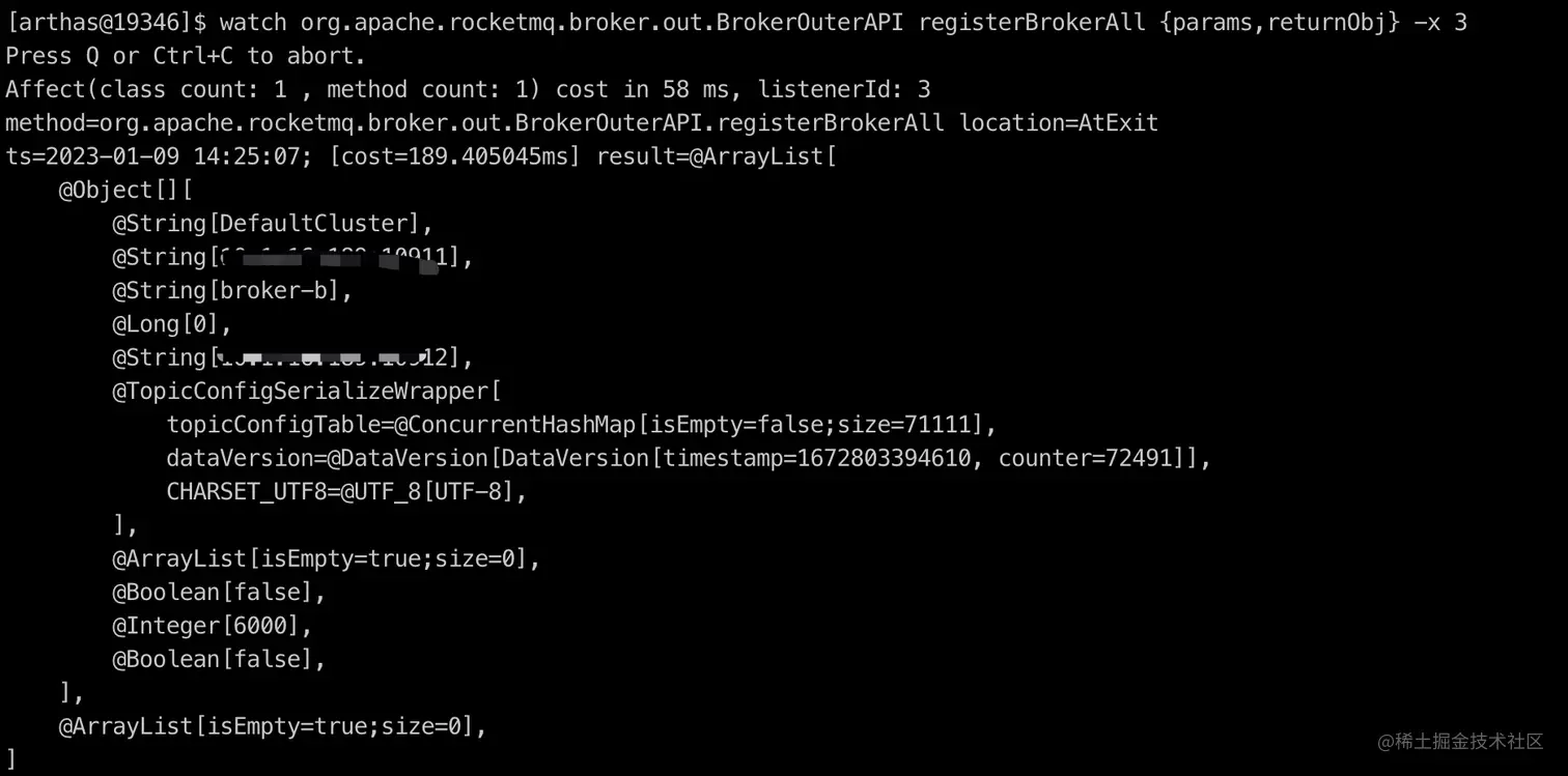 watch org.apache.rocketmq.broker.out.BrokerOuterAPI registerBrokerAll {params,returnObj} -x 3