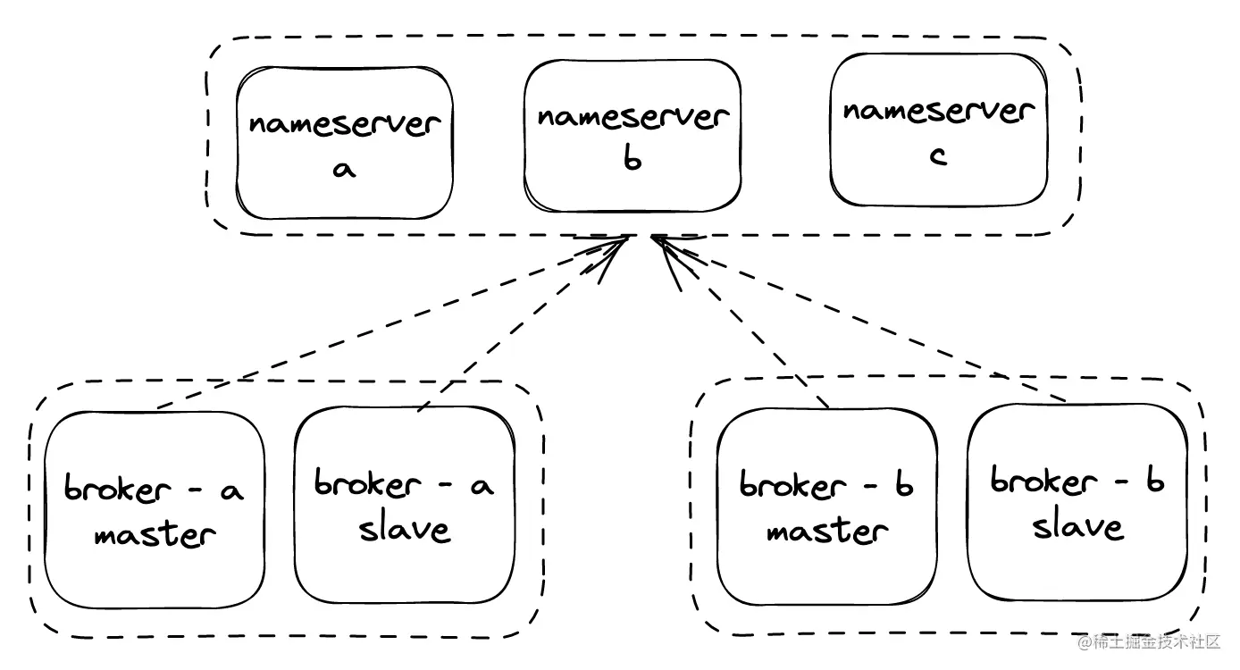我们的RocketMQ集群为4.6.0版本,按照3个nameserver,2个broker,每个broker为主从双节点部署。