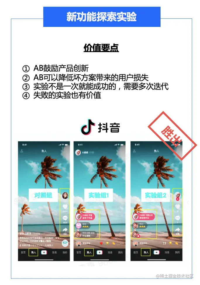 从 DataTester 的实验结果数据看,两个实验组的互动率确实有着显著提升,达到了功能设计时“提升互动率”的初衷。但观察新方案对抖音大盘核心指标影响时发现,这个功能对抖音整体视频的浏览量、用户投稿率、用户整体留存率均有负向影响,上述指标均出现了不同程度的下降。A/B 实验清晰地表明,这个功能虽然能提升抖音的互动率,但却不利于用户的整体使用与留存。因此这个看上去很好的改动并未在抖音全量上线。
