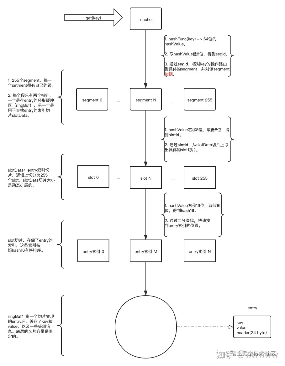 - cache被分为256个segment。这样当写入某个key时,只需要锁定单个segment。这个设计主要是为了减少锁粒度,增加并发性能。