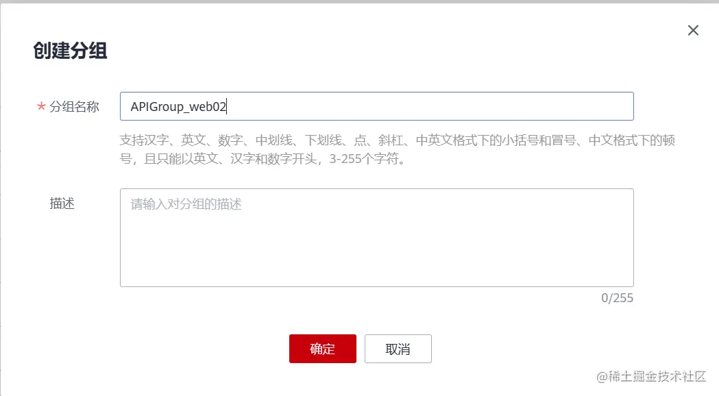设置分组名称为“APIGroup_web02”(可自定义),点击确定完成创建。
