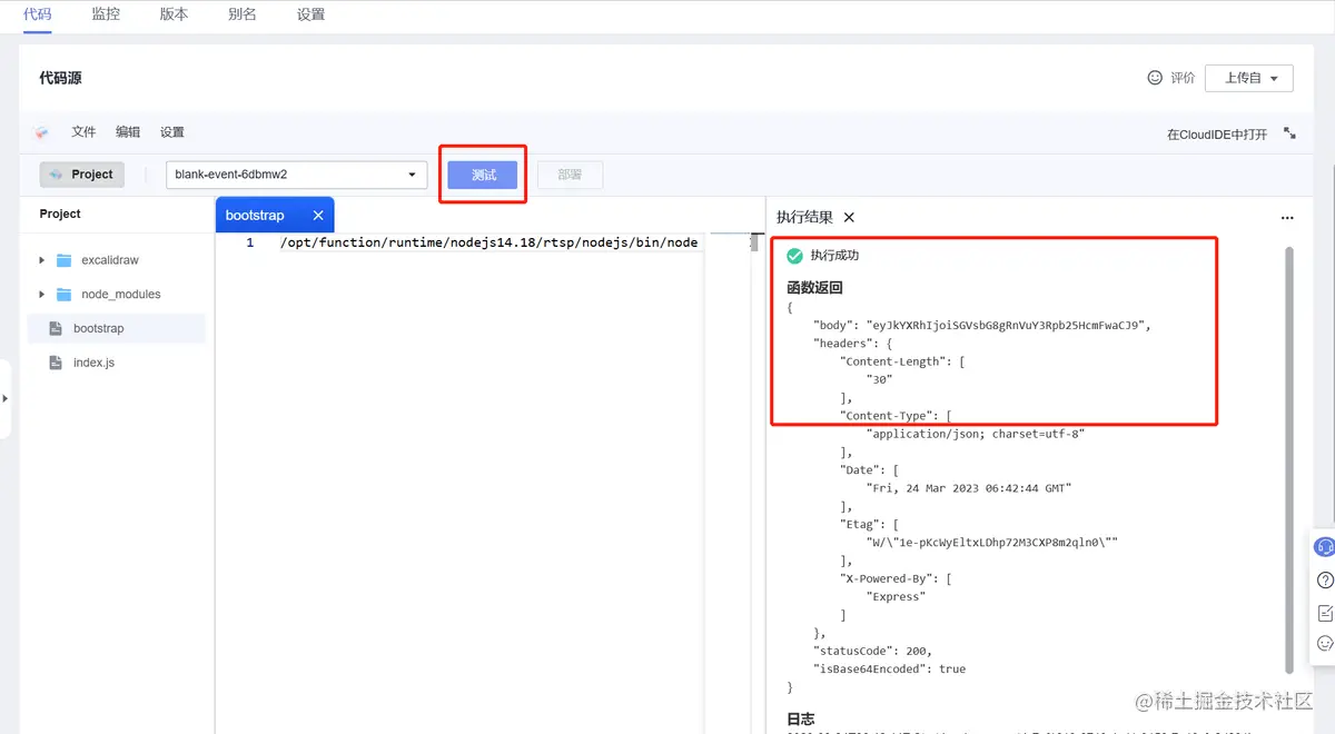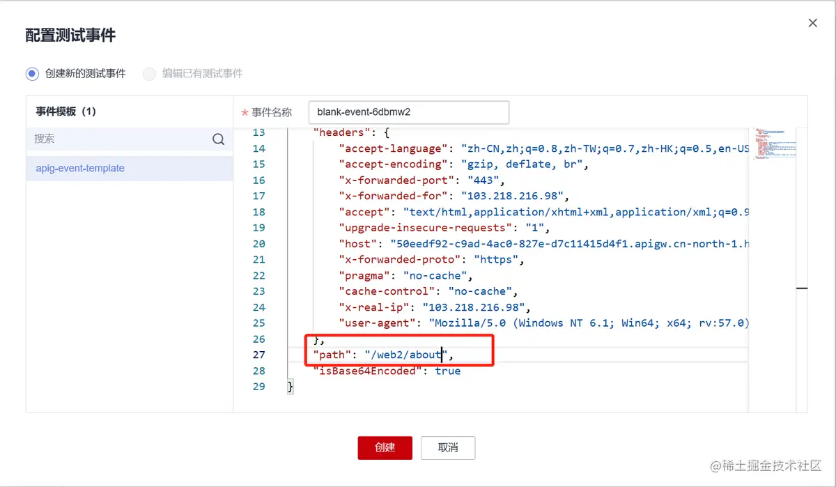 点击“代码”,点击“配置测试事件”,点击“创建”完成测试事件配置。